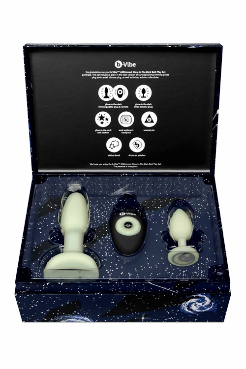 It’s destination Uranus with this bootylicious glow-in-the-dark Butt Play Set from b-Vibe!