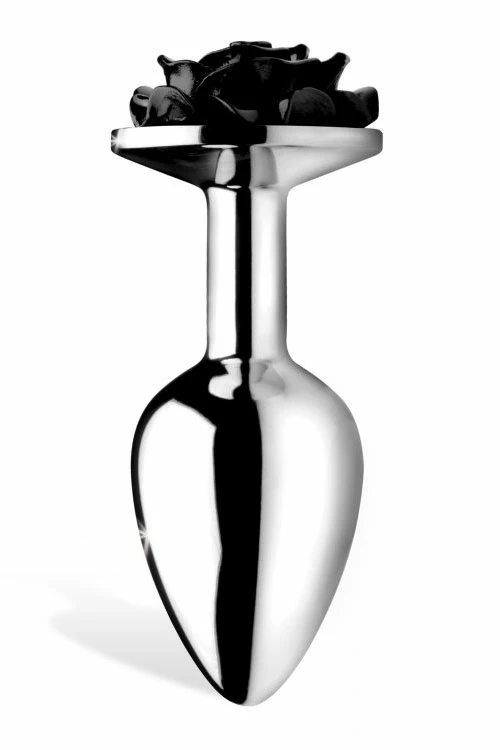 Darkly stunning, this smooth silver butt plug features a black rose at the base to flash as you bend over to tease your partner.