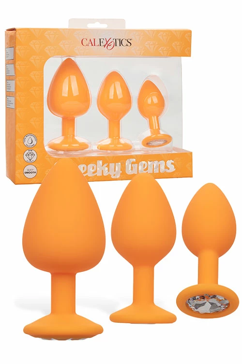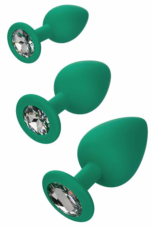 Adorn yourself with this sparkling anal training kit! Featuring a small, medium and large plug, all made from silky body-safe silicone in a firm yet flexible design. Each plug is tapered for easy insertion and the base not only offers safe play but also the added glamour of a bright gem.