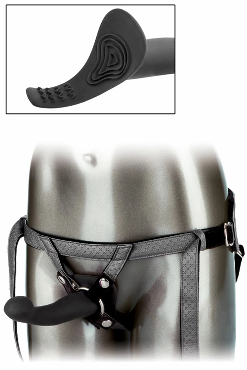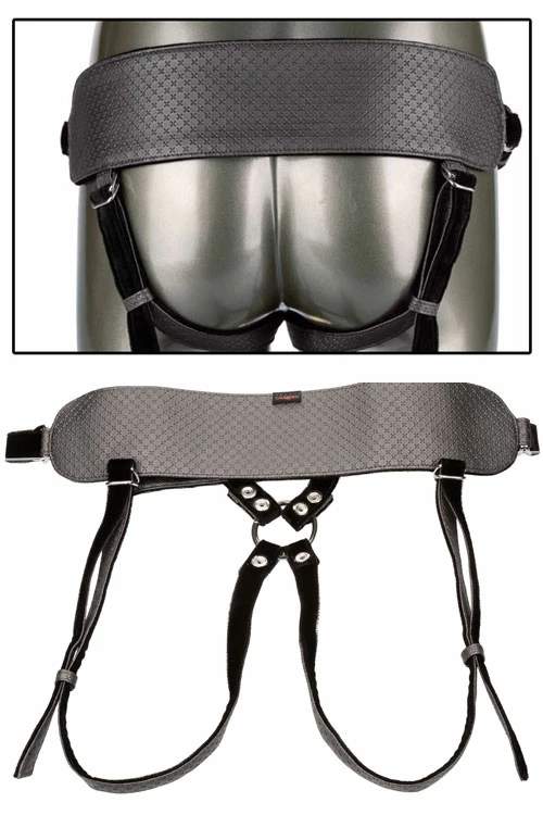 It fits perfectly in the harness, which is crotchless for less restrictive play and has adjustable cinch-style waist and thigh straps for improved fit.
