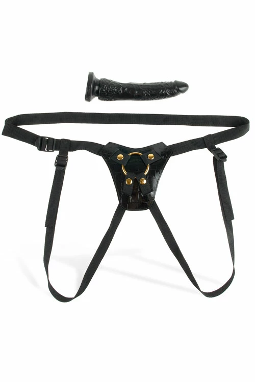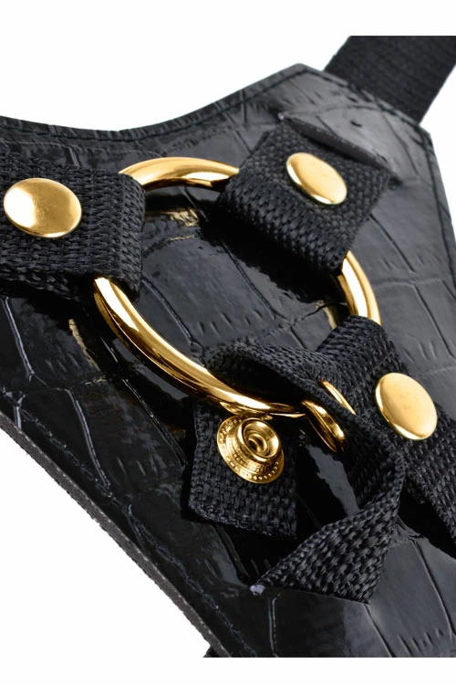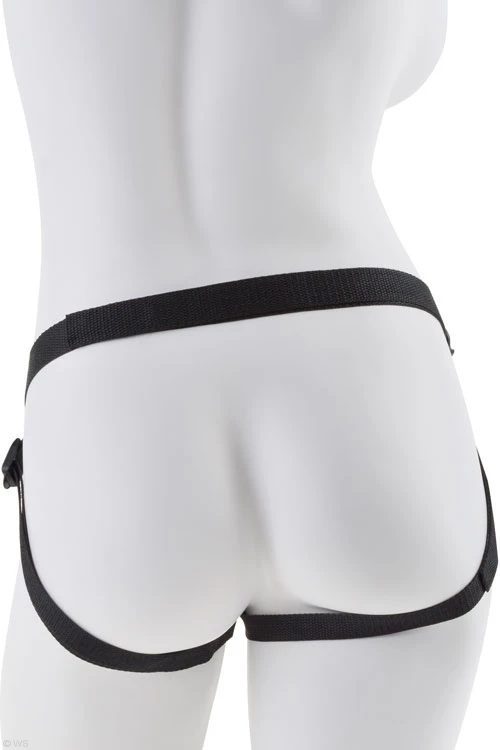 Hit the right spot every time with this elegant Strap-On. This low-rise harness features a soft plush liner that feels great against your skin, while the 4-way nylon straps are fully adjustable to fit most sizes. The metal O-ring holds everything in place when the action heats up, and can be removed to accommodate any sized O-ring.