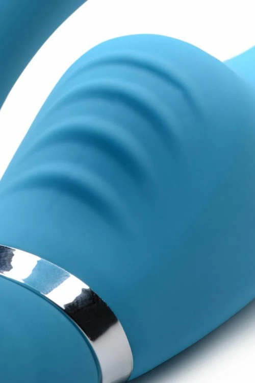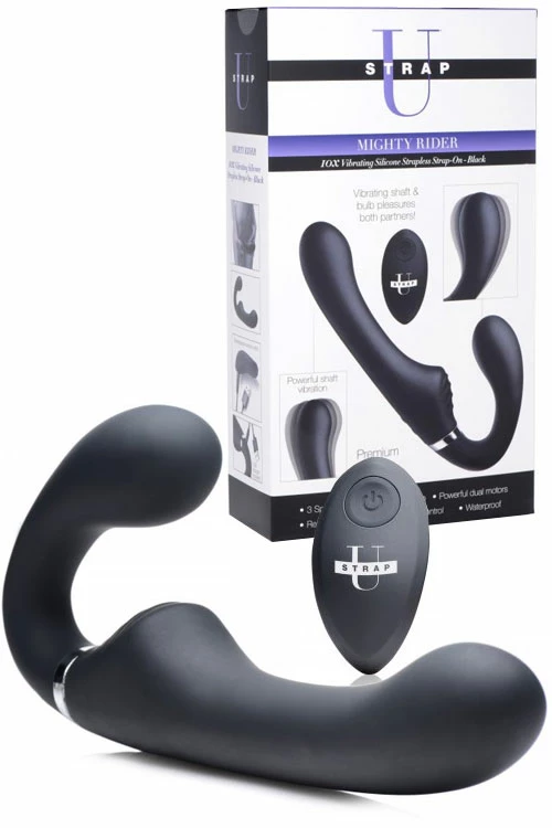 This strapless strap on features a bulb for the wearer to slip inside her vagina and a phallic shaft to penetrate her male or female partner.