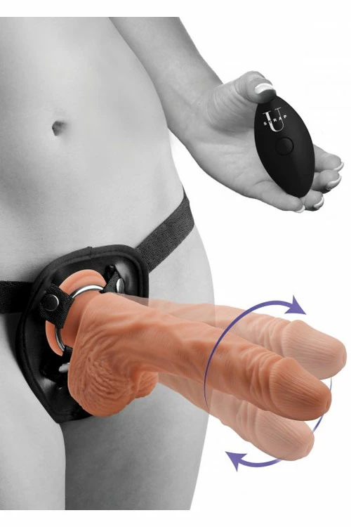 This adventurous set includes a vibrating and rotating realistic dildo with remote control and a cheeky strap on harness.