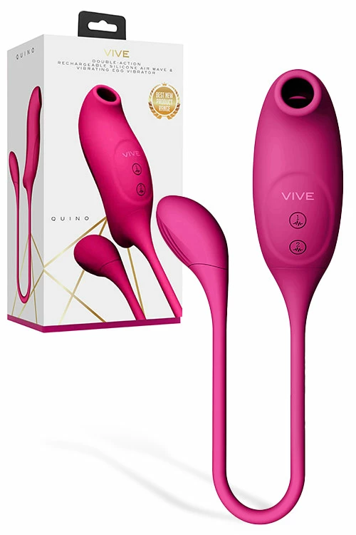 This next generation vibrator features 2 independent motors. The first powers a touch-free airwave suction clitoral stimulator with 10 different pleasure patterns, and the second provides another 10 patterns of vibration for the insertable vibrating egg. With 100 different pleasure combinations and vibration speeds of up to 13,000 RPM, the Quino is designed to bring you mind-blowing blended clitoral and g-spot orgasms.